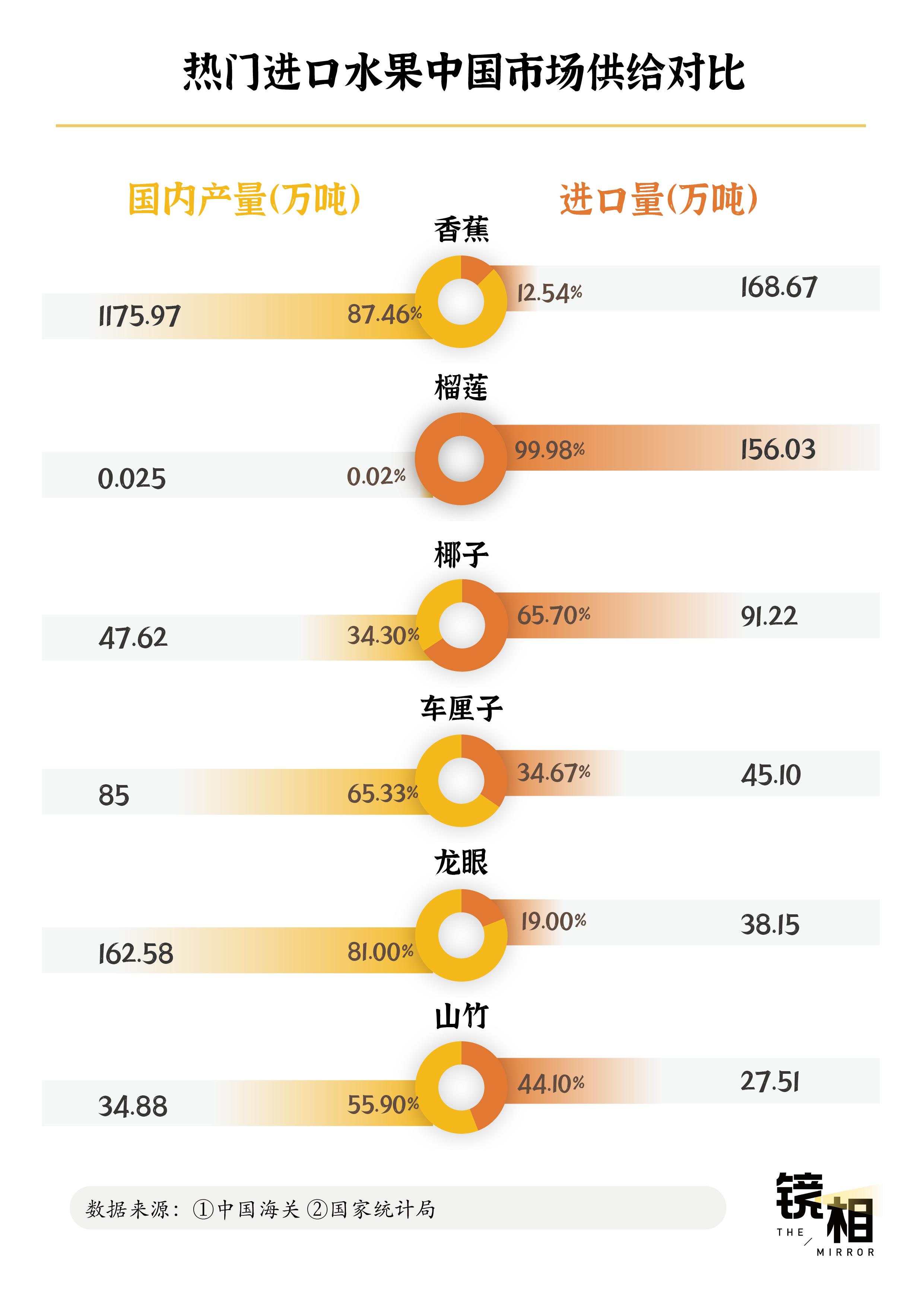 盡管中國(guó)的水果產(chǎn)量豐厚,但中國(guó)仍然是水果的凈進(jìn)口國(guó),2024年進(jìn)口量818.4萬(wàn)噸,是出口量的1.5倍。一方面,消費(fèi)者想要吃到非當(dāng)季的、多品種的水果;另一方面,水果賣(mài)家想延長(zhǎng)銷(xiāo)售期、減少耗損率,而進(jìn)口水果商業(yè)化程度高,自然就成了兩全其美的選擇。如今,中國(guó)市場(chǎng)上的水果消費(fèi)有7%依賴進(jìn)口。
