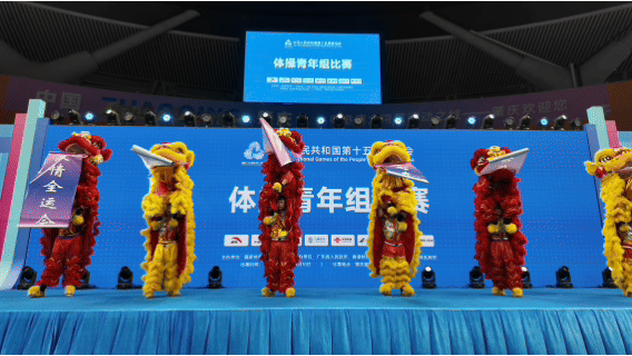 △十五運會體操青年組比賽開幕上的舞獅表演。肇慶發(fā)布廖文奕 攝