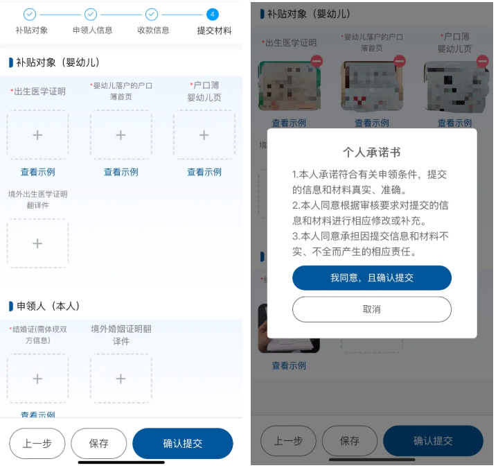 第五步:按照提示提交出生醫(yī)學(xué)證明、嬰幼兒落戶戶口薄首頁、戶口薄嬰幼兒頁、結(jié)婚證等判定撫養(yǎng)關(guān)系的相關(guān)材料,點擊“確認(rèn)提交”按鈕。