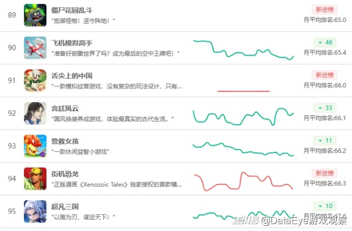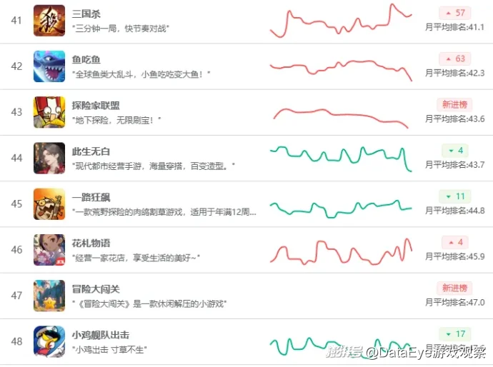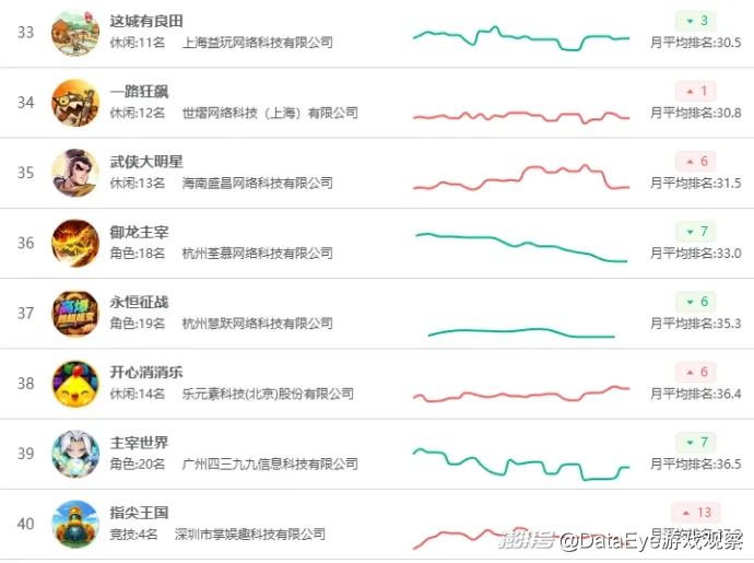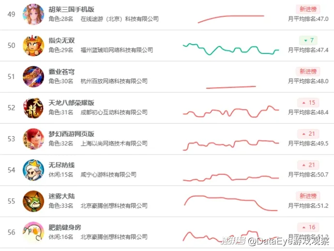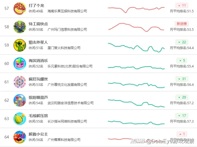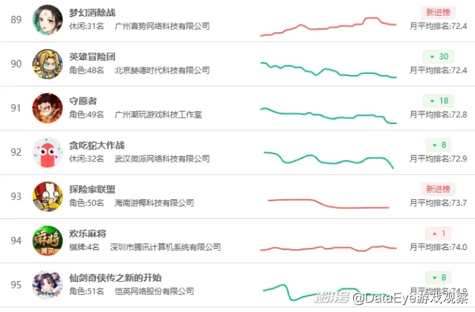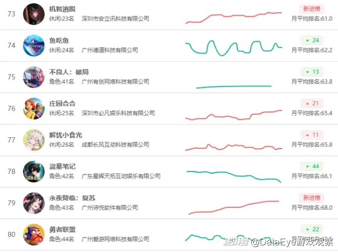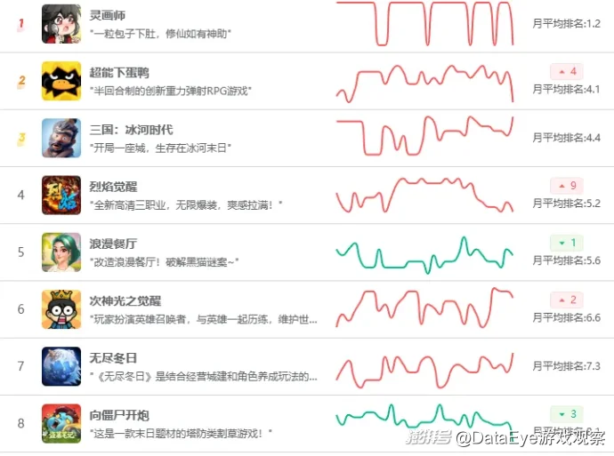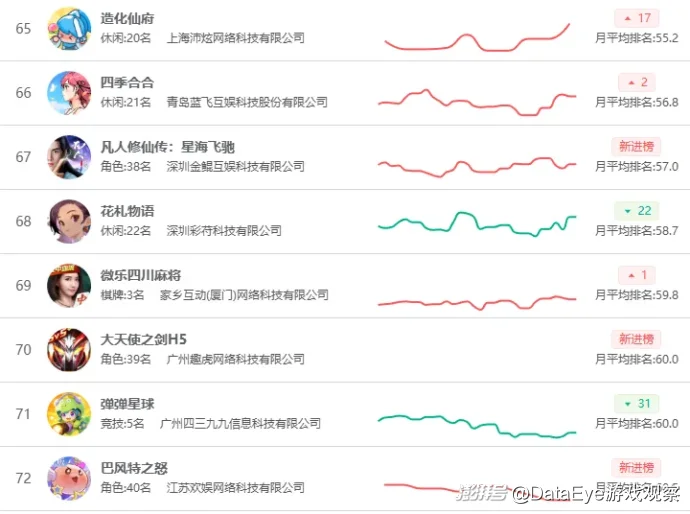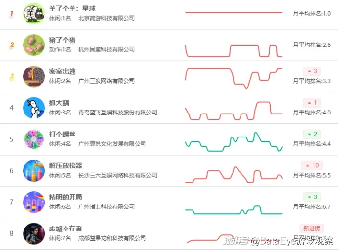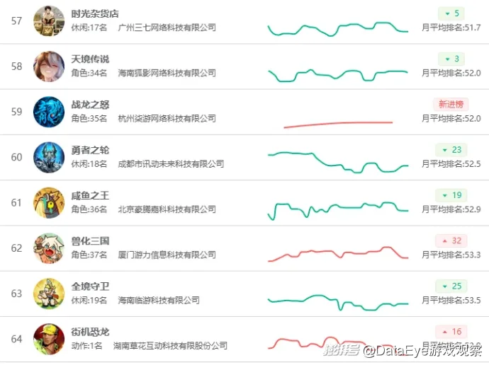多款產(chǎn)品排名飆升,《永遠的蔚藍星球》沖入TOP10,排名月榜第8名。飛魚科技的《獸化三國》排名提升32名,升至榜單第62名。