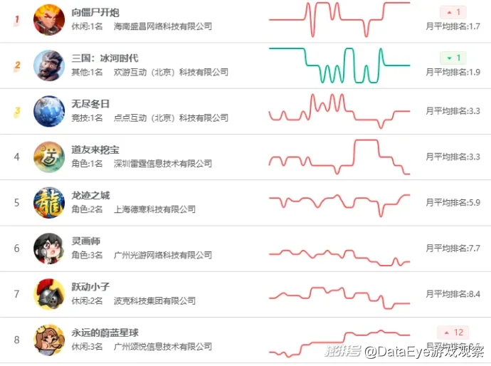 頭部陣營排名出現(xiàn)變化,《向僵尸開炮》超過《三國:冰河時代》重回微信小游戲暢銷月榜第一,《無盡冬日》則維持在月榜第三的位置。《道友來挖寶》《龍跡之城》排名第四、五名。