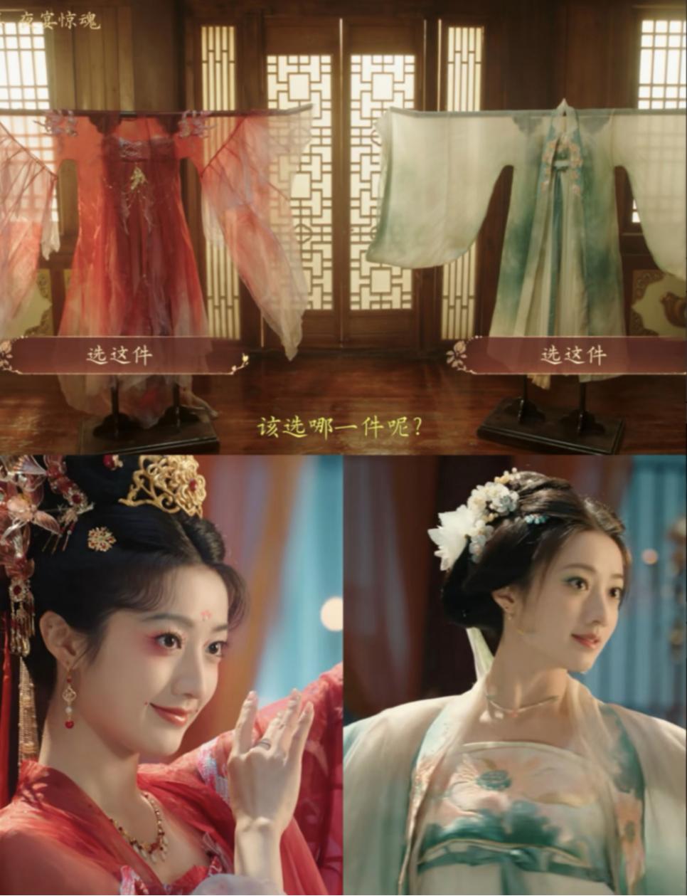 比如,女主角伍元照在參加夜宴前,有紅色和淺綠兩套衣服選擇,那么演員就要身著兩套衣服拍攝兩個版本的情節(jié),部分臺詞甚至一致。