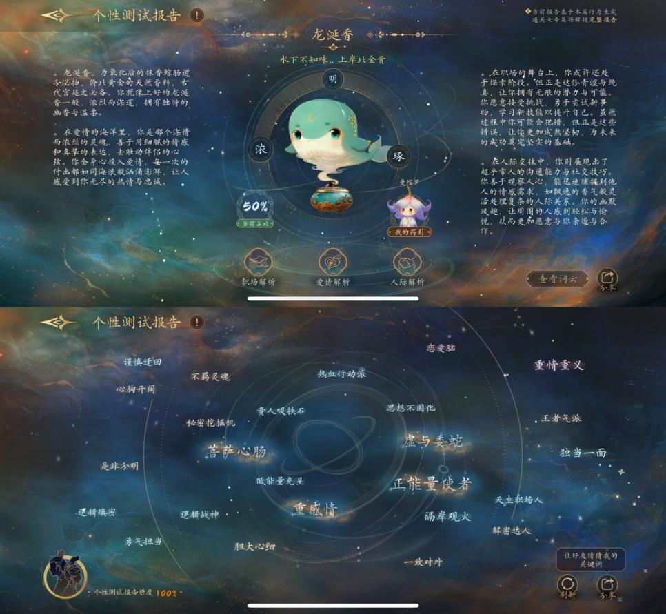 并且創(chuàng)新融入“東方版MBTI”功能,通過初始選擇生成專屬個性測試報告,作為附加驚喜融入該作品中,踐行一個理念: