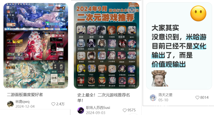 2025年第一季度的數(shù)據(jù)指出,小紅書上的Z世代用戶合計(jì)占比高達(dá)85%,其用戶畫像和泛二次元用戶的特征高度重合。這種天然的用戶基因,也直接反映在小紅書的內(nèi)容生態(tài)中。2024年,二次元及游戲相關(guān)內(nèi)容成為小紅書內(nèi)容發(fā)布量增速TOP5的類目,二次元內(nèi)容同比增長175%,游戲內(nèi)容增長168%。