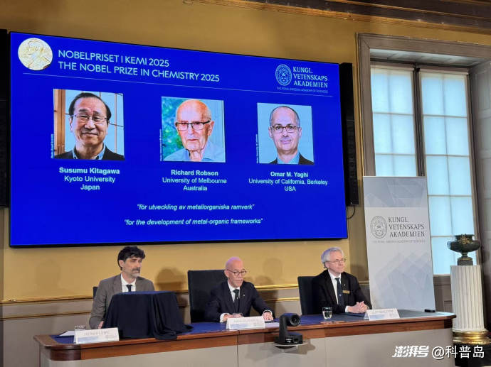 2025 年 10 月 8 日北京時(shí)間 17 時(shí) 45 分,瑞典皇家科學(xué)院決定將2025年諾貝爾化學(xué)獎(jiǎng)授予北川進(jìn)(Susumu Kitagawa,日本)、理查德·羅布森 (Richard Robson,英國)、奧馬爾·M.亞吉(Omar M. Yaghi,約旦裔美國籍)三位科學(xué)家,以表彰他們在金屬有機(jī)框架(metal-organic framework,MOF)領(lǐng)域所做出的貢獻(xiàn)。