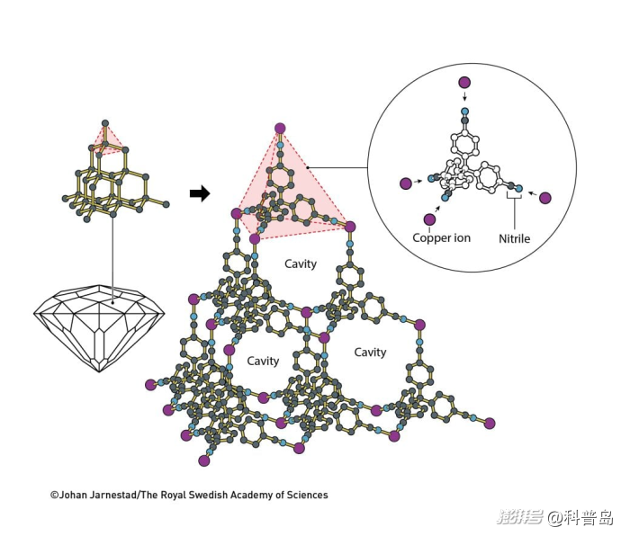 理查德·羅布森利用銅離子和一個(gè)帶有四條臂的分子做出的有序且蘊(yùn)含大量空腔的晶體,圖片來源:諾獎(jiǎng)官網(wǎng)