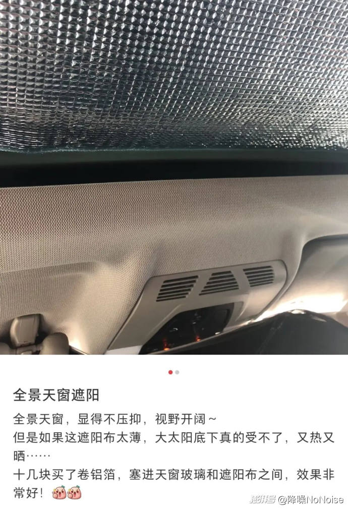 ▲社交平臺上網友們分享用鋁箔棉遮擋全景天幕的方案