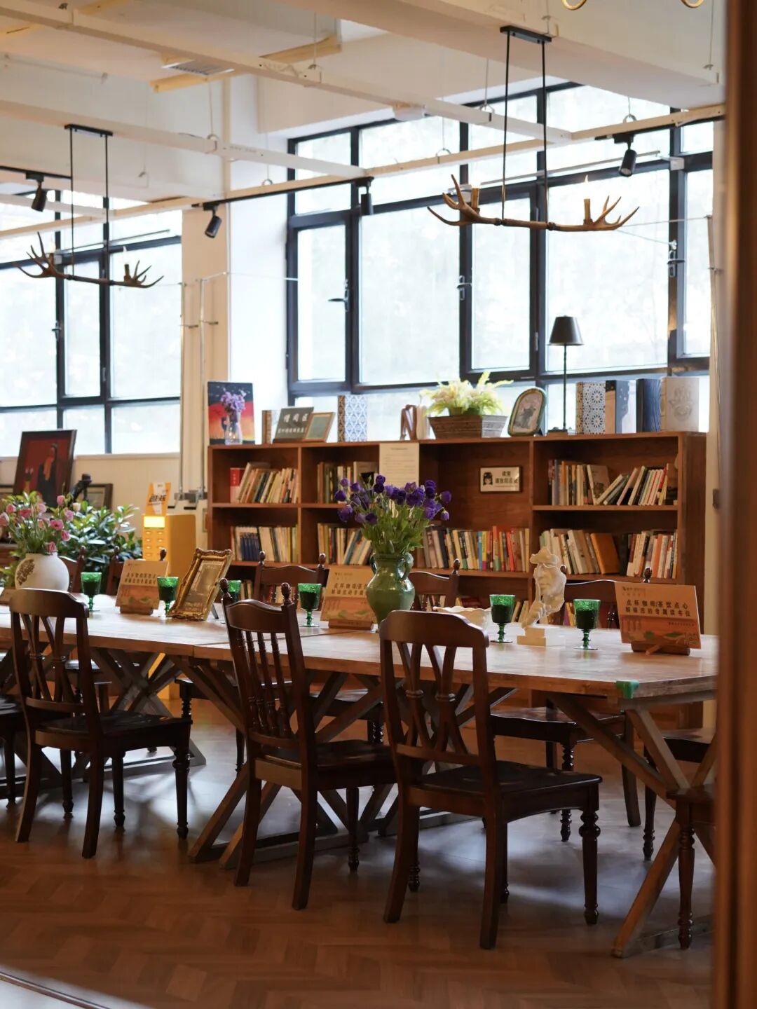 店的深處有一張長(zhǎng)桌,插座集中在這個(gè)區(qū)域,可以投影,很適合小組討論。