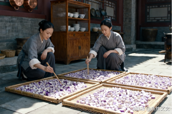 理解了這一點(diǎn),我們再回來看“茄鲞”,是不是就豁然開朗了?曹雪芹在這里用“鲞”字,那叫一個(gè)絕妙!他不是說這道菜里有魚,也不是說它的味道像魚,而是在暗示這道菜的制作工藝。這道茄子做的菜,它的加工過程非常復(fù)雜,完全不是我們平時(shí)那樣簡單地炒一炒、燉一燉。它也要經(jīng)過切、曬、炸、拌、封存等一系列復(fù)雜的工序,最后得到的成品,從形態(tài)和口感上來說,已經(jīng)完全顛覆了茄子原本軟爛的特性,變得筋道、耐嚼,風(fēng)味也極其濃縮和醇厚。