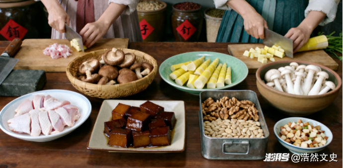 這配料單里,有葷有素,有山珍有干果。雞脯子肉提供鮮味和蛋白質(zhì);香菌、新筍、蘑菇是“山八珍”里的???,提供的是來自山野的鮮美;五香腐干增加了豆制品的復(fù)合香味和嚼勁;最絕的是“各色干果子”,比如核桃仁、松子仁、花生等等,它們的加入,不僅讓整道菜的口感層次暴增,又脆又香,還補(bǔ)充了豐富的堅(jiān)果油脂。