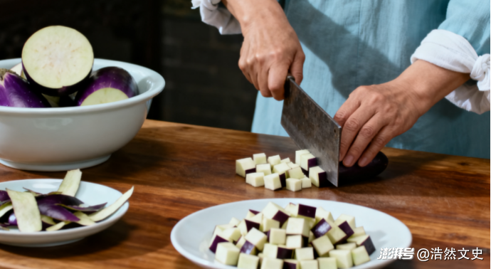 第一步,處理茄子。鳳姐說要“把皮簽了,只要凈肉,切成碎釘子”。這第一步就透著講究。茄子皮不要,只要里面的肉,而且還得是“才下來的”新鮮嫩茄子。切成“碎釘子”,說明對刀工也有要求,大小要均勻。