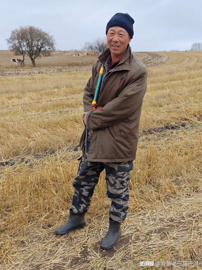 坡地不種莊稼,每年夏天只種些一種像玉米稈似的草料,是牛過(guò)冬的好草料。他說(shuō)他祖祖輩輩生長(zhǎng)在這片土地上,以前趕著牲畜,四處放牧,哪里有好草,帳篷就搭建在那里。如今牧民有了自己的村落,有了固定的草場(chǎng)和土地,再也不用趕著牲畜找草場(chǎng)了。牛兒在草場(chǎng)自由吃草,不用他操心,他只是每天在草場(chǎng)上轉(zhuǎn)轉(zhuǎn),看看他家的牛就行了。我問(wèn)他認(rèn)識(shí)他家的牛不?他點(diǎn)著頭,我問(wèn)牛認(rèn)識(shí)他不,他也點(diǎn)頭。并說(shuō),牛就像家人,你天天和它們相處,它們知道你是它們的主人。
