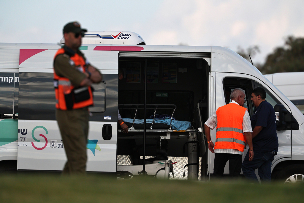 10月13日,以色列拉馬特甘謝巴醫(yī)療中心,以色列士兵和醫(yī)護人員準備救護車和設備,以接收哈馬斯釋放的被扣押人員。