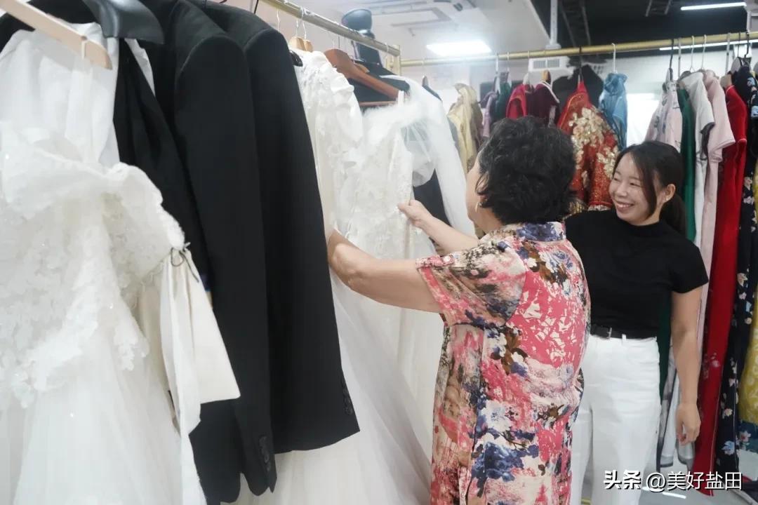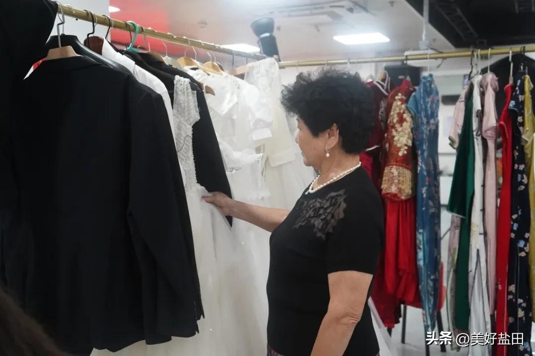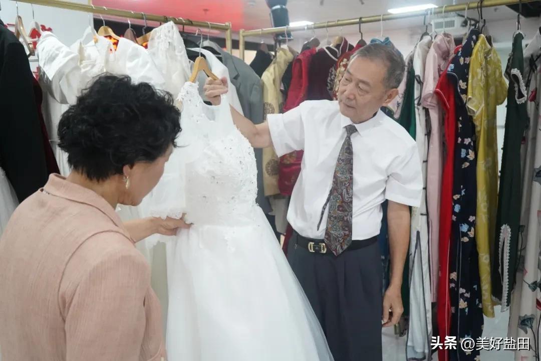 不多時,一對對老年夫婦陸續(xù)抵達(dá)?;顒蝇F(xiàn)場,阿姨們被精美禮服深深吸引?!斑@件適合我嗎?尺碼合適嗎?”“這件的設(shè)計(jì)真別致,我要試試這件!”在服裝師的熱情推薦下,“新娘”們反復(fù)比較,仔細(xì)挑選,最終都心滿意足地選定了自己的“夢中情紗”。