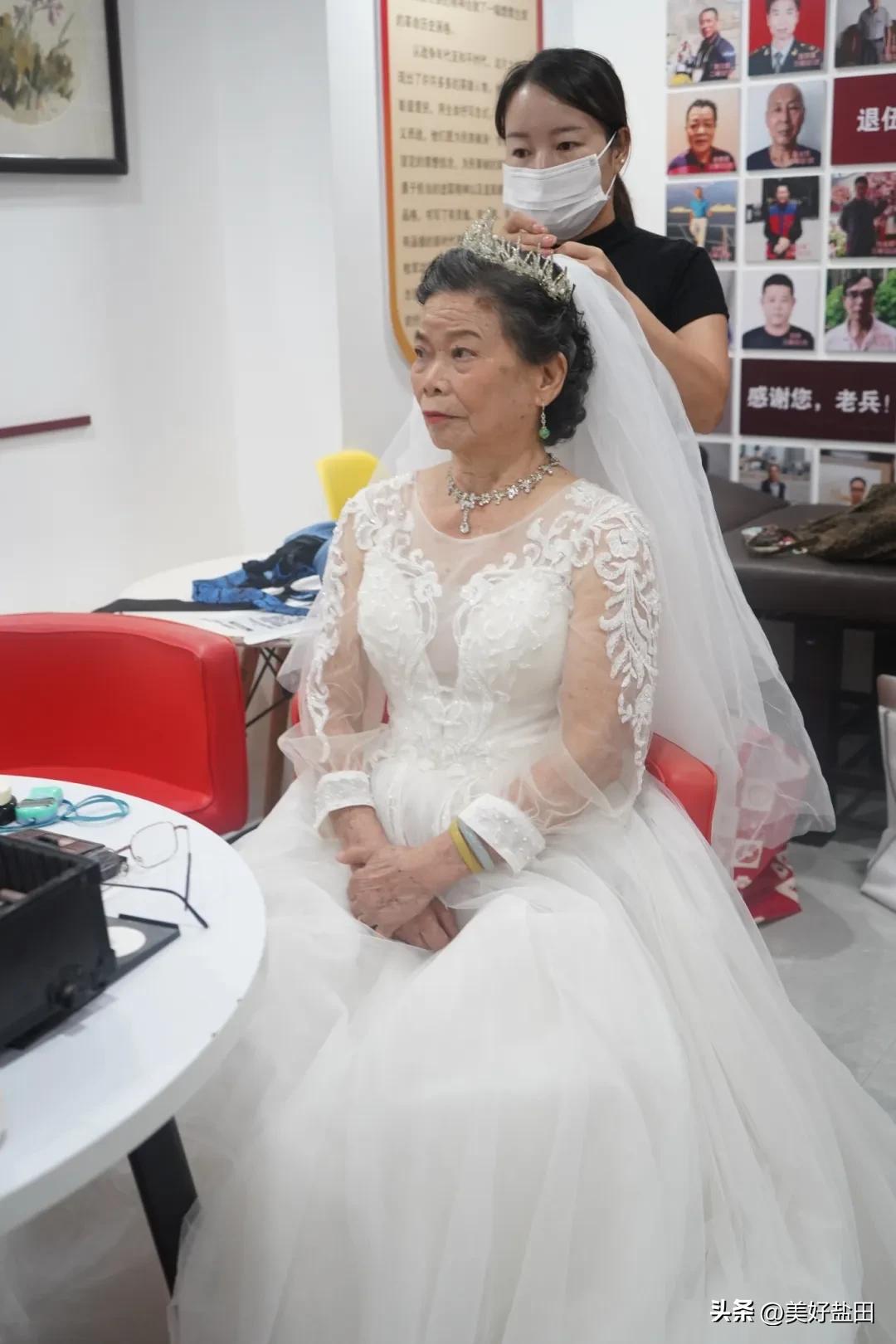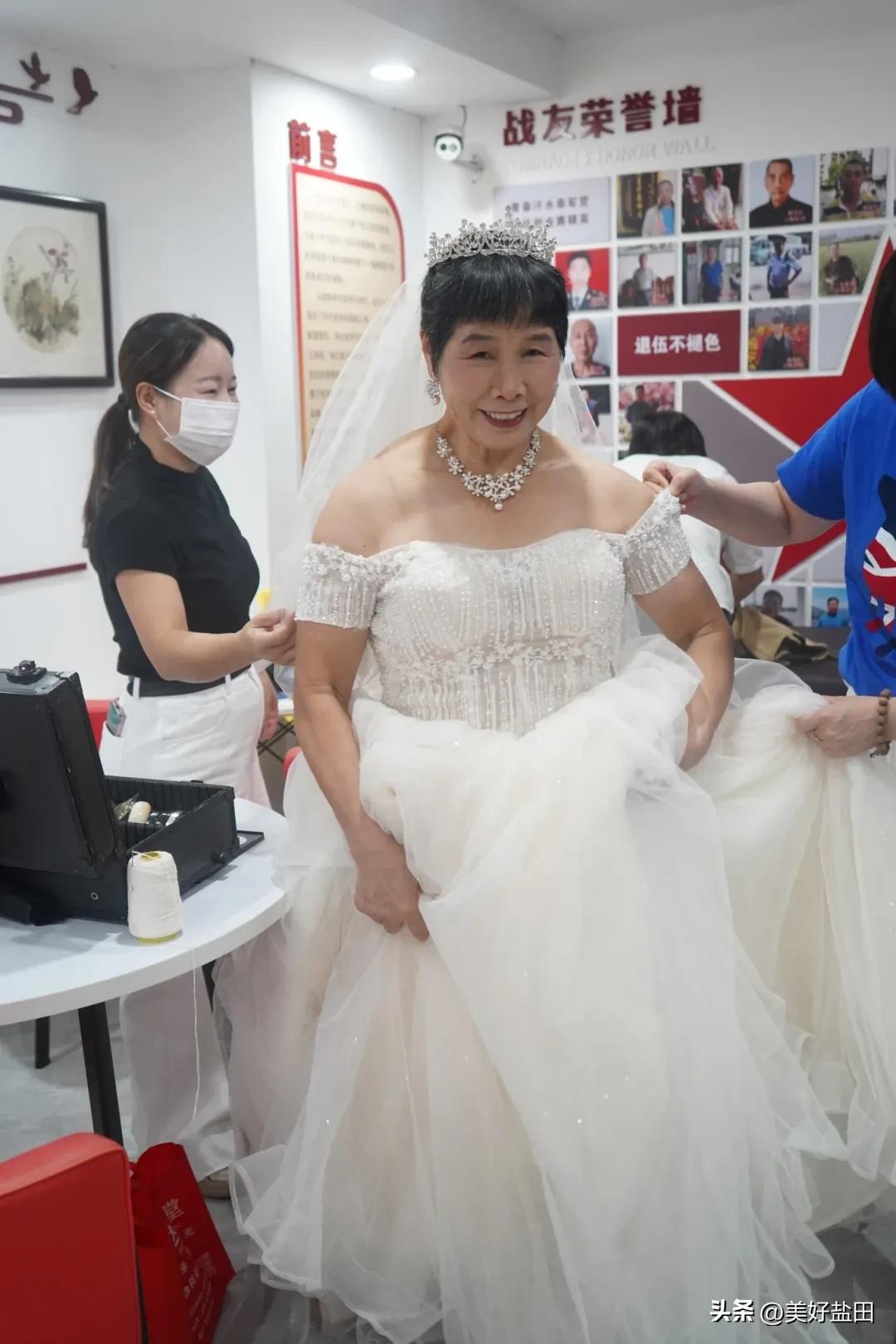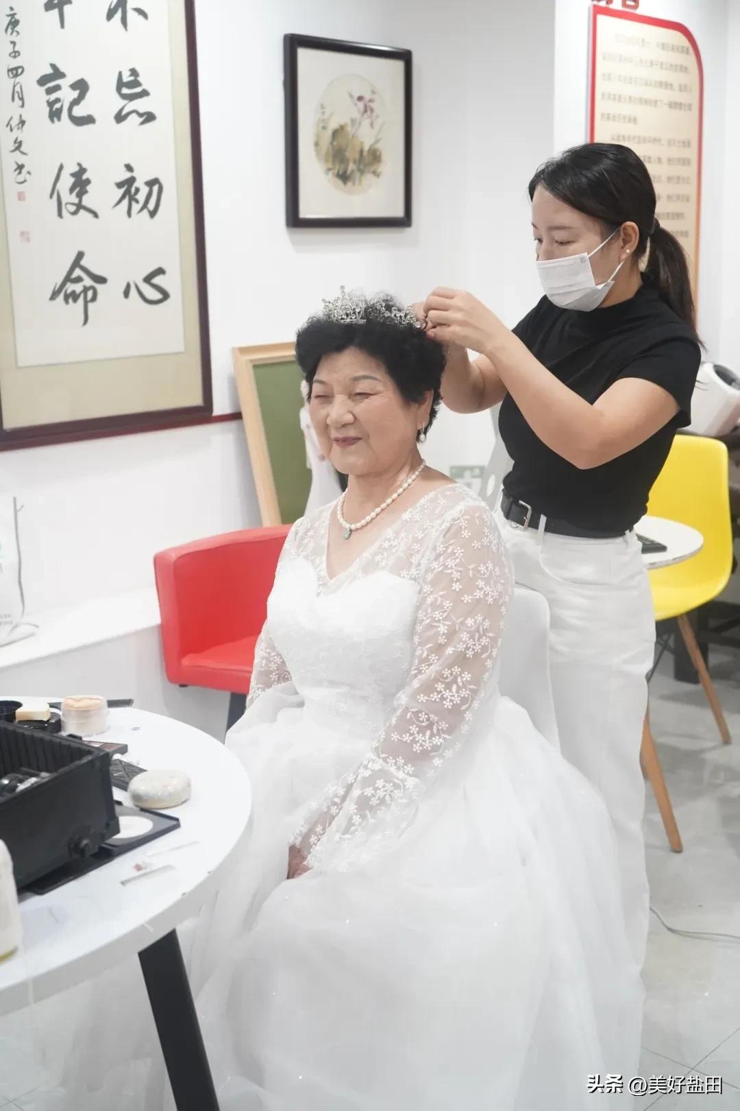 當(dāng)阿姨們換上心儀的潔白婚紗,披上頭紗,戴上閃亮的配飾,攬鏡自照時,驚喜的笑容在她們臉上綻放:“太漂亮了!”