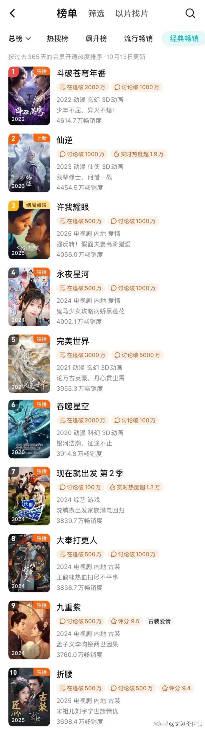 截至目前,騰訊視頻“經(jīng)典暢銷榜”前10名中,《斗破蒼穹年番》《仙逆》《完美世界》《吞噬星空》四部熱門年番上榜,其余均為《許我耀眼》等在播劇集爆款或《大奉打更人》《九重紫》等曾產(chǎn)生破圈效應的劇集IP;B站經(jīng)典年番《凡人修仙傳》累計播放量超46億,年番化后用戶續(xù)費率明顯提升。對平臺而言,年番已成為穩(wěn)定用戶基本盤的“定海神針”。