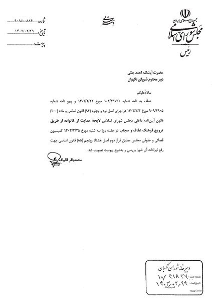 巴霍納爾所指的《頭巾與貞潔法》是伊朗議會(huì)于2023年通過、但尚未正式實(shí)施的一項(xiàng)新法案。該法案原計(jì)劃在2024年正式生效,旨在加強(qiáng)對(duì)不遵守頭巾規(guī)定者的處罰機(jī)制,包括高額罰款、吊銷駕駛證或護(hù)照、禁止出境、關(guān)閉營(yíng)業(yè)場(chǎng)所、借助監(jiān)控?cái)z像頭識(shí)別未佩戴頭巾者。
