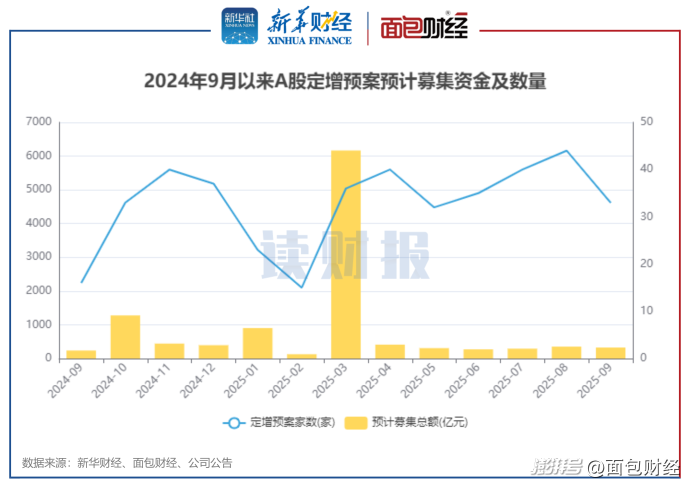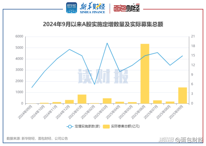 統(tǒng)計(jì)顯示,2025年9月,A股上市公司共計(jì)實(shí)施定增15起,同比上升200%;實(shí)際募資總額約1447.14億元,同比上升10359%。