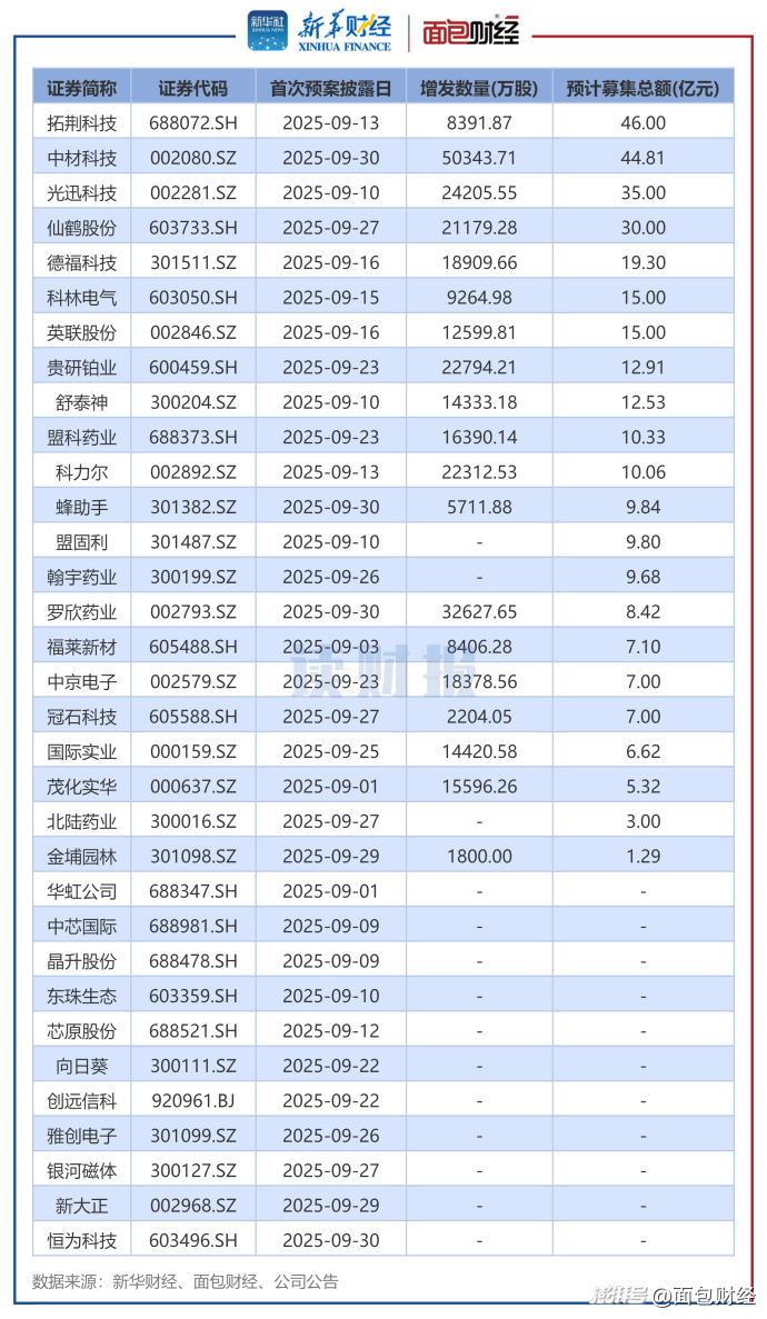 按照首次披露預(yù)案日口徑統(tǒng)計(jì),2025年9月A股上市公司定增預(yù)案發(fā)布數(shù)量共計(jì)33起,擬募資規(guī)模約326億元,同比上升37.45%。其中,拓荊科技、中材科技等企業(yè)擬募資規(guī)模相對靠前。