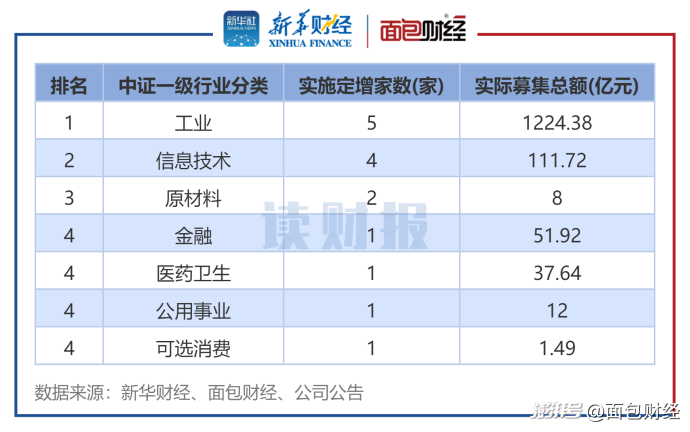 從行業(yè)分布來看,以中證行業(yè)統(tǒng)計(jì),工業(yè)行業(yè)實(shí)施5起定增,募資規(guī)模合計(jì)約1224.38億元,數(shù)量和金額均排在各行業(yè)之首;其次是信息技術(shù)行業(yè),有4起定增實(shí)施;原材料行業(yè)排名第三,有2起定增實(shí)施。