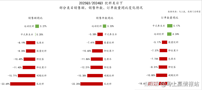 除此以外,傳統(tǒng)主流類目則是普遍呈現(xiàn)“三降”。即飲茶、即飲果汁、碳酸飲料、乳飲料等均在銷售額、件數(shù)、訂單數(shù)上全面下滑,其中乳飲料降幅最大(銷售額–22.7%),或與去年的回調(diào)相關(guān);即飲茶(包括有糖&無糖即飲茶)也延續(xù)了此前整體的調(diào)整趨勢,無糖茶增速也在進(jìn)一步放緩,類目的銷售額、銷售件數(shù)、訂單數(shù)量均同比下跌約8%~12%。包裝水、即飲果汁、能量飲料三個類目的銷售額同比下滑幅度均>訂單數(shù)量同比下滑幅度,或可說明幾個類目依然存在一定的價格壓力。
