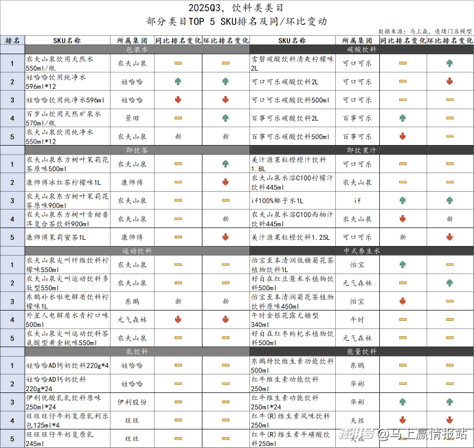 在本季度飲料類類目的Top SKU變動上,幾個點(diǎn)的變化值得關(guān)注: