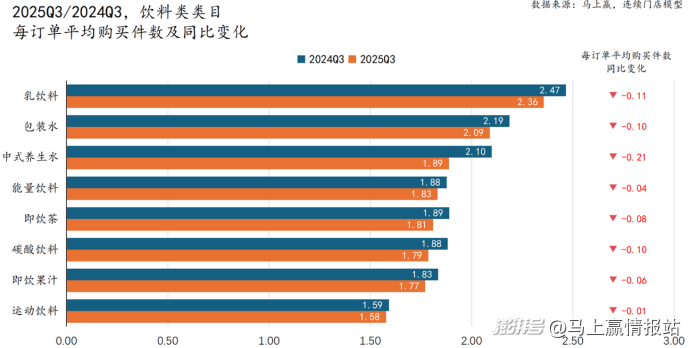 從整體來看,2025Q3飲料類目各細(xì)分品類的每訂單平均購買件數(shù)均較去年同期下降,其中中式養(yǎng)生水下降最為明顯,達(dá)到-0.21pcs/每訂單平均。
