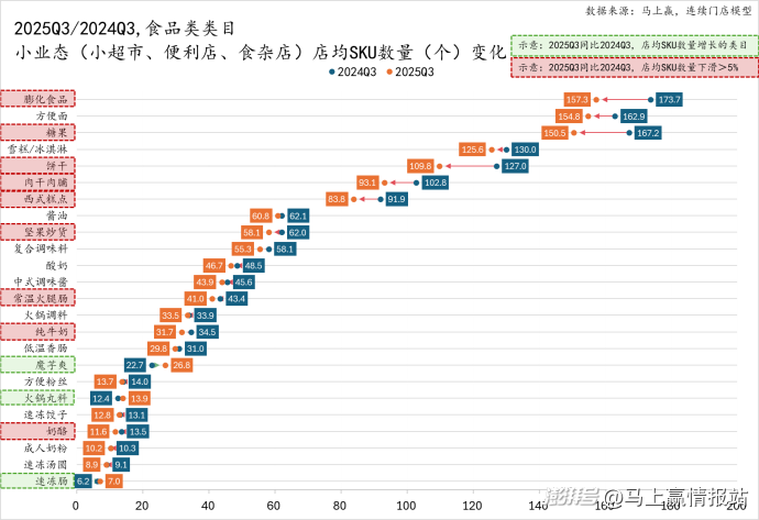 從2025Q3小業(yè)態(tài)(小超市、便利店、食雜店)的店均SKU變化趨勢上看,其方向與大業(yè)態(tài)總體一致——休閑零食類普遍減少,速食類與即食類相對穩(wěn)健,如魔芋爽、火鍋丸料、速凍腸SKU數(shù)量上升,反映出消費(fèi)者對“快餐化”“即食化”產(chǎn)品需求的持續(xù)增強(qiáng),小業(yè)態(tài)也在積極順應(yīng)這種高頻、高轉(zhuǎn)化的消費(fèi)趨勢。