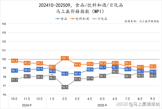 從趨勢上看,進(jìn)入Q3以來,三者走勢呈現(xiàn)較大的差異——飲料在5–6月達(dá)到階段高點(diǎn)(99.5–99.6)后,隨著夏季旺季的競爭加劇在7–9月略有回落,或可提示今年的競爭依然以“以價換量”與“性價比”策略為核心;食品價格亦從99.1下滑至98.6,趨勢上依然呈現(xiàn)一定程度的下行;相比來說,日化品則呈現(xiàn)出一定的回升。