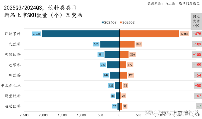 2025Q3,飲料類整體新品上市數(shù)量較去年同期普遍下降,僅運(yùn)動飲料輕微增長(+7個SKU)。從整體趨勢來看,品牌普遍進(jìn)入節(jié)奏放緩與結(jié)構(gòu)優(yōu)化階段。傳統(tǒng)大類如果汁、乳飲料、碳酸飲料和包裝水均出現(xiàn)不同程度的下滑,顯示出行業(yè)進(jìn)入理性競爭周期,新品投放更趨謹(jǐn)慎。