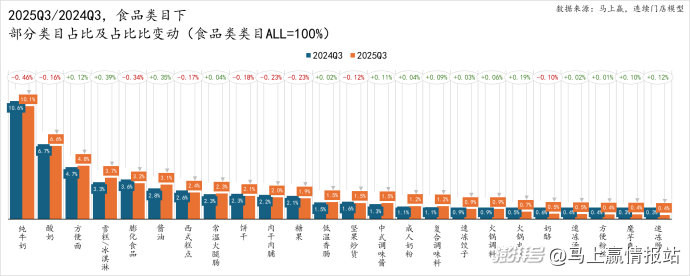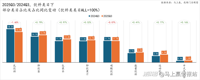 2025Q3的飲料類目中,乳飲料呈現(xiàn)明顯的占比同比下滑,碳酸飲料小幅下滑,其余類目則均呈現(xiàn)占比同比上漲。