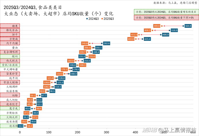 在下面的組圖中,類目文字上有綠色虛線方框意為該類目在該業(yè)態(tài)類型中的店均SKU數(shù)量同比有所增長,沒有背景色塊的、紅色虛線方框的類目則是店均SKU數(shù)量同比有所減少,其中紅色虛線方框?yàn)?025Q3同比2024Q3,店均SKU數(shù)量同比下降超過5%的類目,敬請知悉。