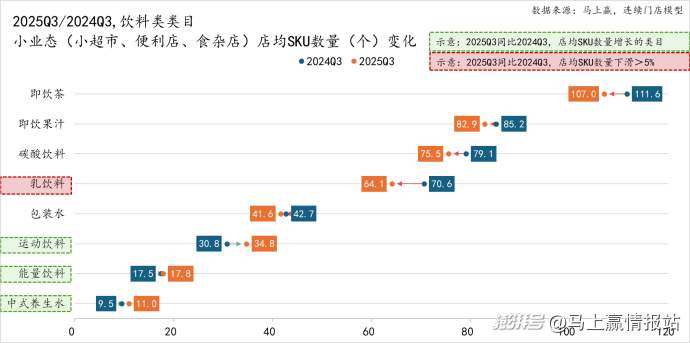 2025Q3,飲料類類目,小業(yè)態(tài)中,店均SKU數(shù)量下降的類目更多,同比上升的僅有運(yùn)動飲料、能量飲料與中式養(yǎng)生水。乳飲料呈現(xiàn)較明顯的下滑,即飲茶、即飲果汁、碳酸飲料的店均SKU數(shù)量則是小幅下滑。
