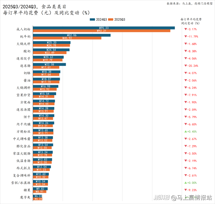 從整體來看,2025年Q3食品類目中,不同子類目的每訂單平均花費(fèi)差異顯著,其中成人奶粉、純牛奶、酸奶、奶酪等乳制品整體依然位居前列,顯示其相對高客單價的特性。但與此同時,這些高價類目的同比降幅也較為明顯,尤其是純牛奶類目,其每訂單平均花費(fèi)同比下降接近12%,或許也是上文中提到的占比、類目銷售額同比下降的重要構(gòu)成因素之一。