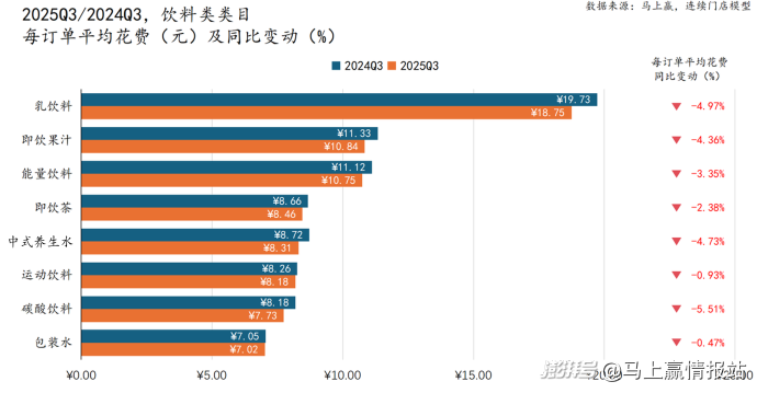 從整體來看,2025Q3飲料類目下各選取類目的每訂單平均花費(fèi)全部同比下滑,反映出消費(fèi)者在飲料消費(fèi)上更加重視性價比,以及品牌之間的價格競爭持續(xù)、激烈。其中,乳飲料雖然仍以18.75元的單筆花費(fèi)居于首位,但同比下降幅度達(dá)到–4.97%;碳酸飲料的平均花費(fèi)同比下降–5.51%,為同比降幅最大的類目。這兩個類目的每訂單平均花費(fèi)下滑或許都體現(xiàn)了健康消費(fèi)潮流對于消費(fèi)者飲料消費(fèi)決策造成的影響。
