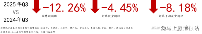 為盡可能準(zhǔn)確呈現(xiàn)線下零售趨勢,剔除門店數(shù)量變動所帶來的影響,本次季度復(fù)盤以馬上贏【連續(xù)門店模型】樣本集數(shù)據(jù)為基礎(chǔ)(除馬上贏價格指數(shù)),即樣本集均為截至2025年10月,連續(xù)在網(wǎng)超過15個月及以上的門店,2024Q3/2025Q3樣本規(guī)模一致。在所有的數(shù)據(jù)圖中,數(shù)據(jù)來源部分均標(biāo)識了所使用的數(shù)據(jù)模型,請各位讀者仔細(xì)甄別。