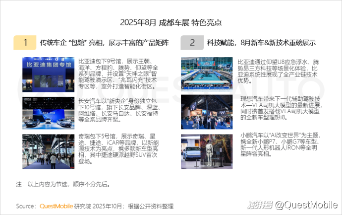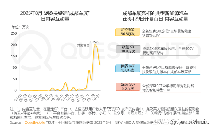 5、【成都車展】8月成都車展自主品牌崛起,通過智能化技術(shù)突破實現(xiàn)市場主導(dǎo),推動行業(yè)從傳統(tǒng)制造向科技驅(qū)動的生態(tài)重構(gòu),開幕當(dāng)日內(nèi)容互動量達(dá)到196萬,市場關(guān)注度高漲
