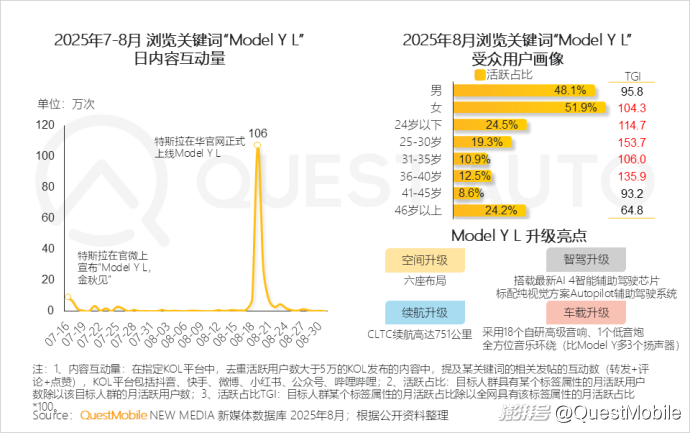 QuestMobile數(shù)據(jù)顯示,從7月特斯拉在官微上宣布Model Y L金秋發(fā)布后,持續(xù)引發(fā)全網(wǎng)關(guān)注,發(fā)布當(dāng)月備受女性、40歲以下群體青睞。