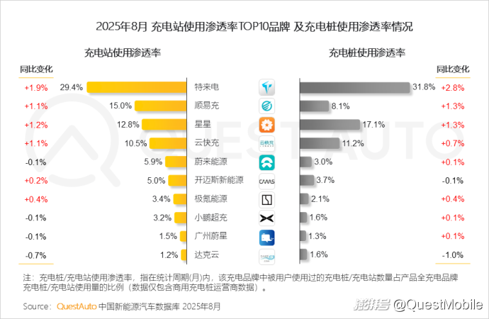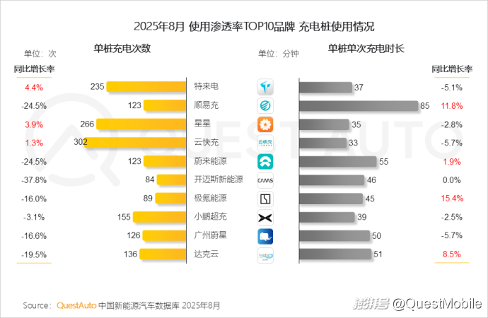 1、特來電、順易充、星星在充電站使用滲透率保持前三;此外,隨著用戶自駕出游需求的增長,TOP 10品牌中的大部分充電站及充電樁使用滲透率較去年同期有所提升