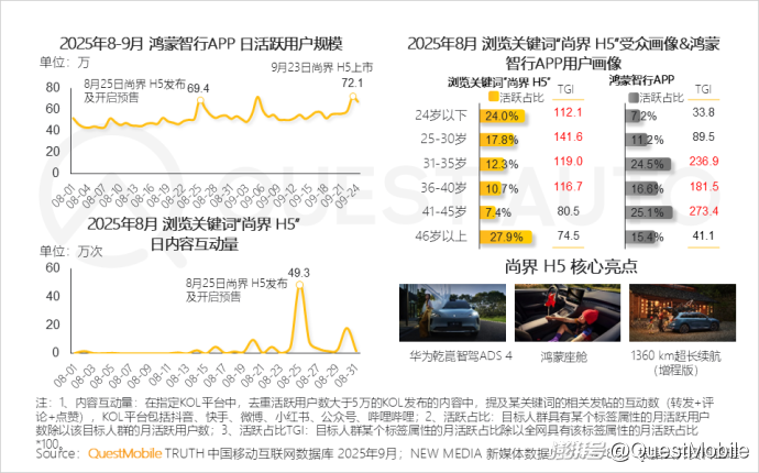 QuestMobile數(shù)據(jù)顯示,鴻蒙智行APP在8月25日尚界H5發(fā)布、9月23日正式上市時分別達(dá)到流量小高峰,分別為69.4萬,72.1萬。此外,尚界 H5廣受40歲以下中青年群體的關(guān)注。