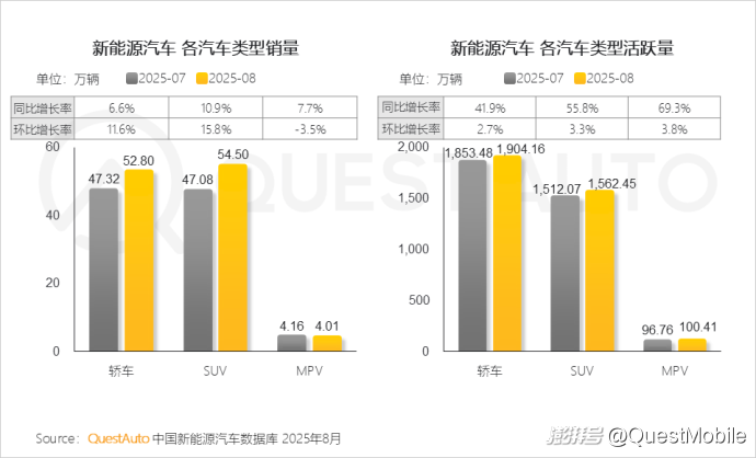 5、8月新能源汽車市場中, SUV銷量以54.50萬輛超越轎車;轎車、SUV銷量和活躍量均實現(xiàn)同環(huán)比雙增長的情況
