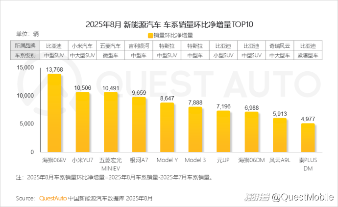 1、8月銷量環(huán)比凈增量TOP10車系中,比亞迪表現(xiàn)突出,旗下四款車型躋身銷量環(huán)比增幅前十,其中海獅06EV以近1.4萬輛的凈增銷量領(lǐng)跑,近期新車銀河A7、風(fēng)云A9L凈增量均超5000輛