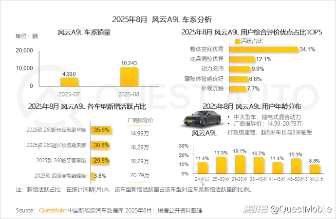 4、風(fēng)云A9L作為奇瑞旗下首款C級旗艦轎車,在空間、底盤調(diào)校、動力及駕駛體驗方面受到用戶的認(rèn)可,其中2025款 260超長續(xù)航豪華版車型新增活躍占比超35%QuestAuto數(shù)據(jù)顯示,風(fēng)云A9L的用戶群體中,35歲以下的用戶占比達(dá)47.8%。
