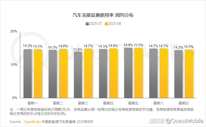 3、與上月相比,8月新能源汽車充能設(shè)施每日使用率環(huán)比均有不同程度提升,其中星期三增長最高,達(dá)0.9%