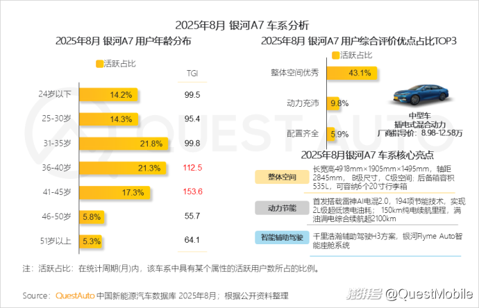 3、銀河A7售價低于15萬元,擁有B級尺寸和C級空間,其搭載的194項節(jié)能技術(shù),實現(xiàn)了2L級超低饋電油耗,有效降低用戶出行成本,36-45歲用戶群體更為突出
