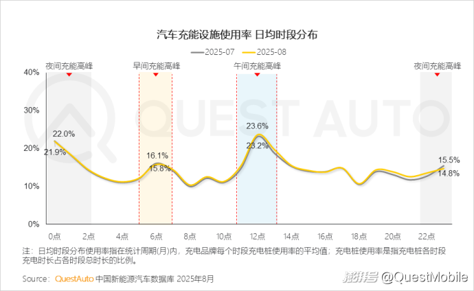 4、與上月相比,8月午間充能時段新能源充能設(shè)施使用率小幅提升,午間充能高峰提升0.4%,夜間、早間充能時段的使用率環(huán)比略降