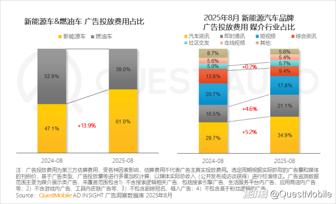 1、與去年同期相比,新能源車企廣告投放費用占比趕超燃油車,其投放重心向汽車資訊、即時通訊及社區(qū)交友行業(yè)遷移