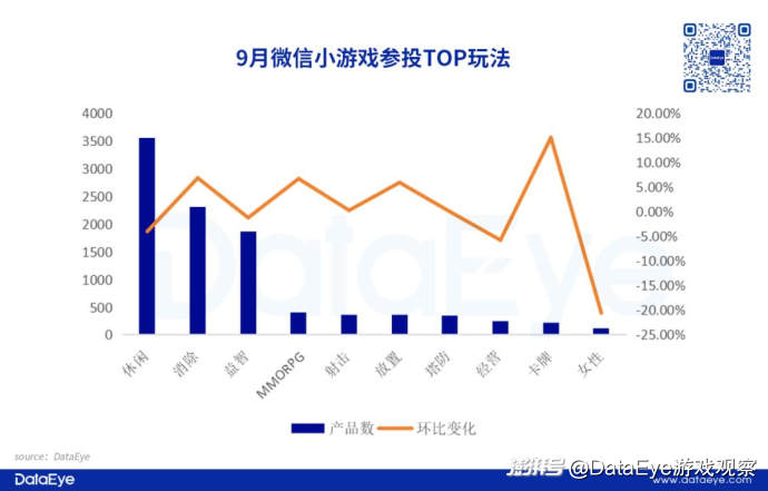 在9月參投微信小游戲玩法TOP10分類中,休閑排名TOP玩法第一,消除排名第二,益智類排名第三。整體來(lái)看,卡牌類在9月增長(zhǎng)明顯,但女性向品類參投數(shù)減少超過(guò)20%。
