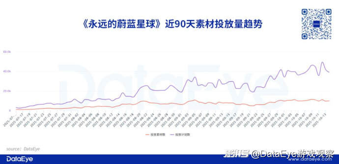 《永遠(yuǎn)的蔚藍(lán)星球》繼續(xù)保持強(qiáng)勁的消耗勢(shì)頭,繼上月首次進(jìn)入月度消耗榜TOP20后,在9月提升7個(gè)排名,沖到月消耗榜第7的位置。DataEye-ADX投放數(shù)據(jù)顯示,《永遠(yuǎn)的蔚藍(lán)星球》8月份上線以來(lái)素材投放量持續(xù)強(qiáng)勢(shì),Q3單日投放素材量峰值超過(guò)1萬(wàn),并且排名Q3投放素材榜第7。