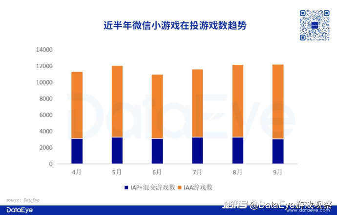 投放游戲數(shù)方面,9月在投微信小游戲數(shù)約1.22萬(wàn)款,環(huán)比8月增加50款產(chǎn)品,單月投放游戲數(shù)繼續(xù)保持增長(zhǎng)趨勢(shì)。不過(guò)混變+IAP投放在投游戲數(shù)有所下滑,而IAA小游戲在投數(shù)增長(zhǎng)明顯。